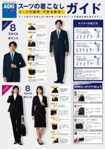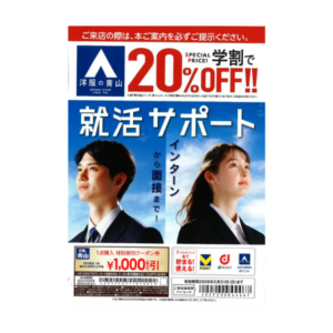 スーツのほか、シャツやシューズがお手頃な価格で一式揃う「就活セット」をはじめ、広い店舗と豊富な品揃えが特徴です。初心者も安心してスーツ選びができるよう、スタッフが一人ひとり丁寧に対応してくれます。