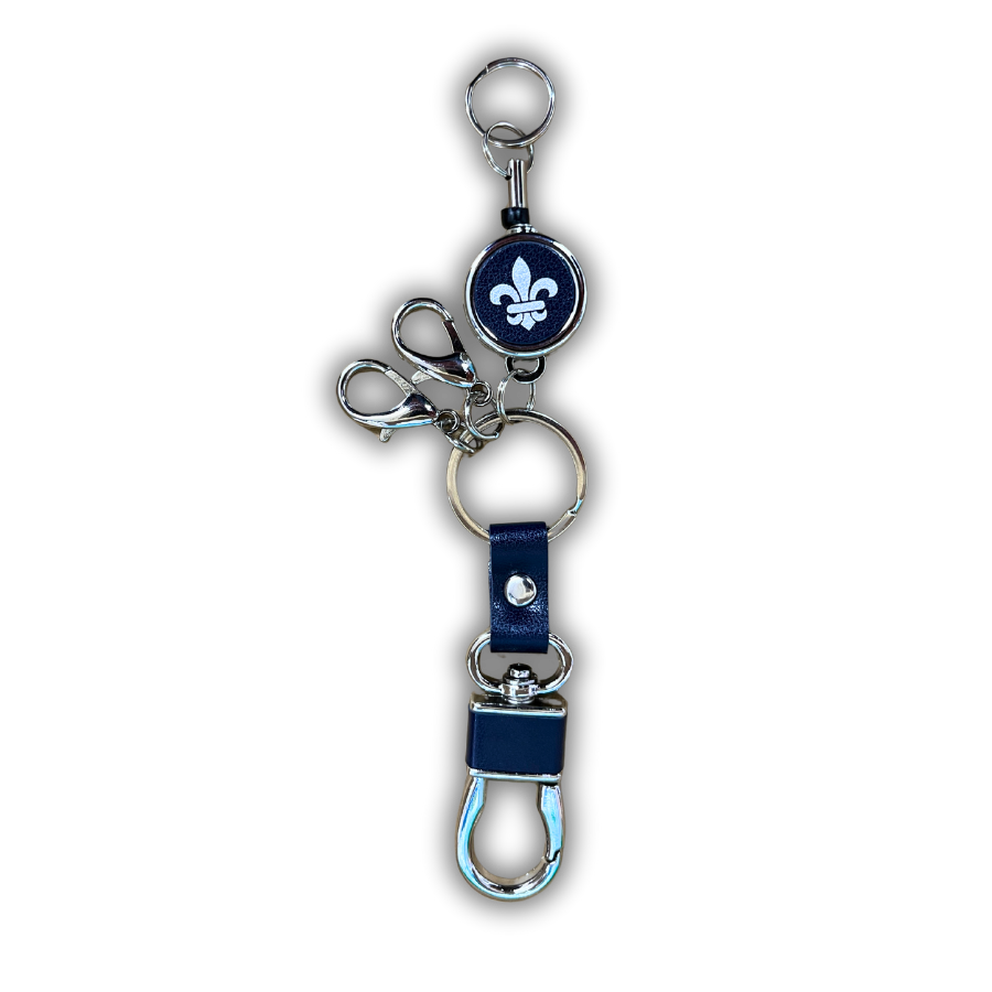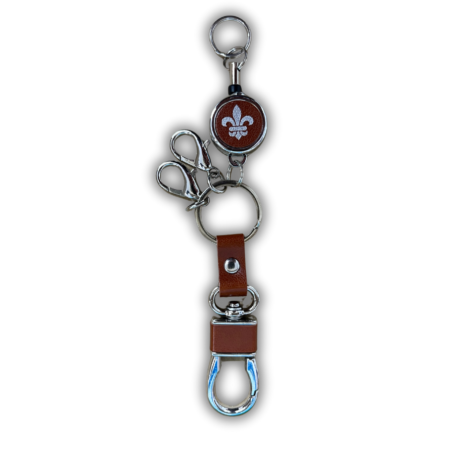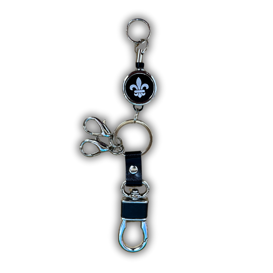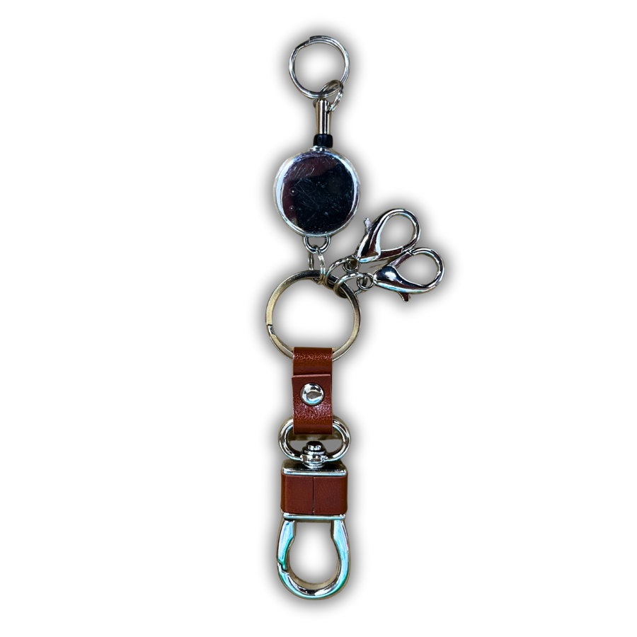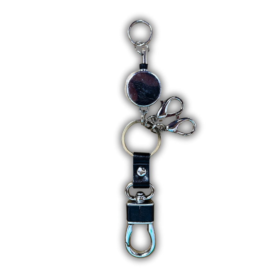 バッグやベルトループに付けておき、鍵を開ける際はリールを伸ばして使用できるコンパクトなキーホルダーです。