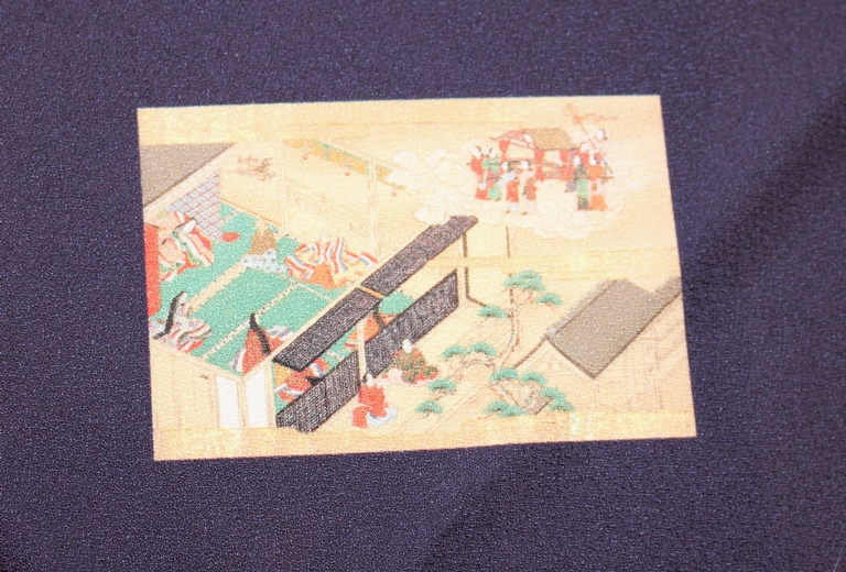 立教大学図書館に所蔵されている竹取物語絵巻物は、その現存数が少ない中でも非常に状態が良く、発色も美しく保たれています。この絵巻物から6場面を選定し、友禅染に近いやわらかな風合いで風呂敷に再現しました。