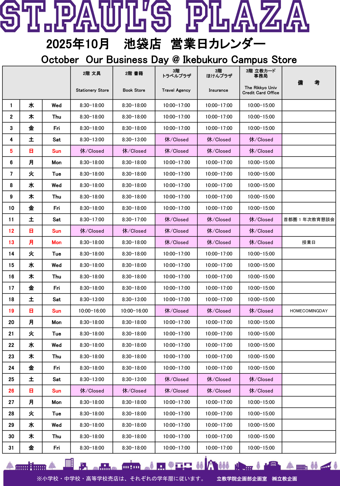 4月営業日カレンダー 5月営業日カレンダー 6月営業日カレンダー 7月営業日カレンダー 8月営業日カレンダー 9月営業日カレンダー 10月営業日カレンダー