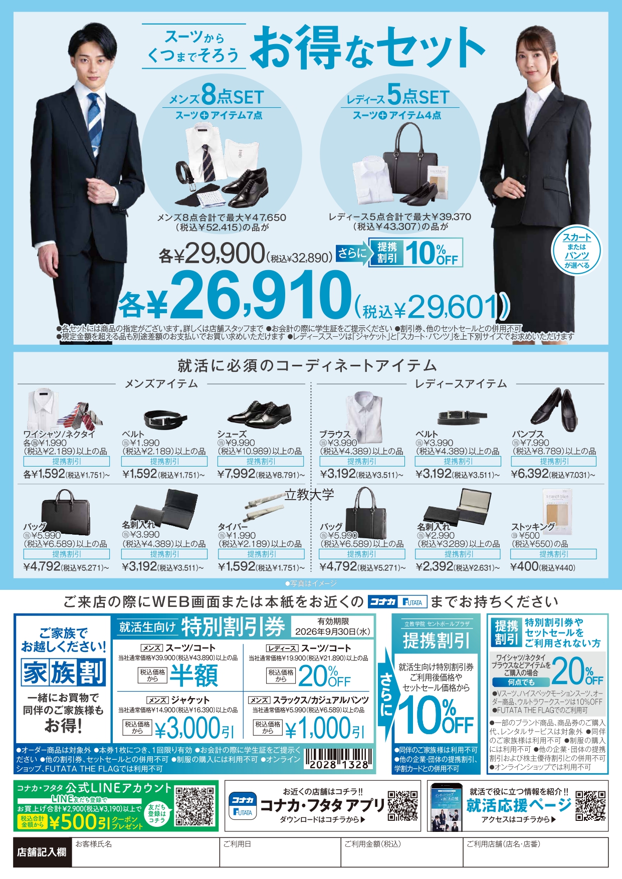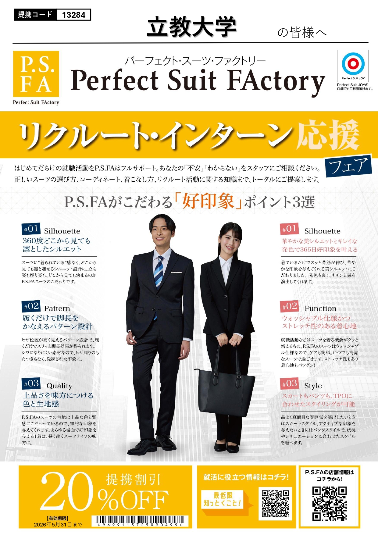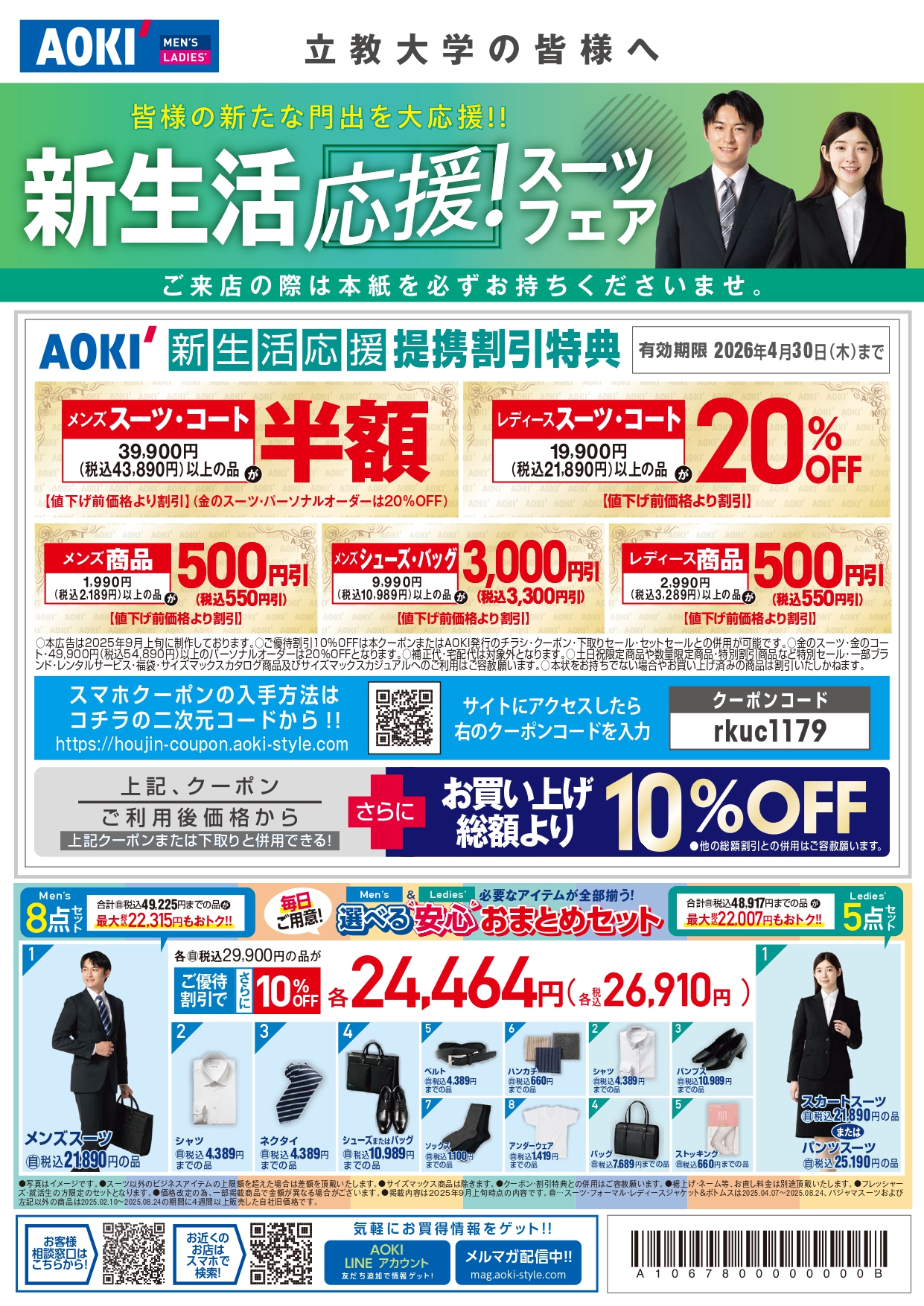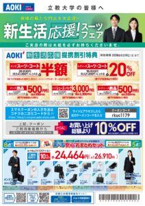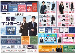 専門の就活アドバイザーが必要なアイテムのアドバイスや、インターン等で使えるフレッシュなスタイルの提案もしてくれます。立教生向けのお得なセットセールも要チェックです。